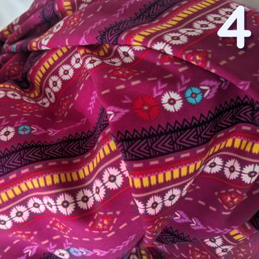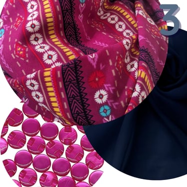 Pink Aztec Crepe with Navy Chiffon: The crepe and chiffon are both flowy, lightweight fabrics, giving this combo a lot of movement. It's breathable and very comfortable. The print with the navy makes this skirt fun, but not silly. The pearly pink buttons elevates the skirt, making it good for both everyday wear and something a little fancier.