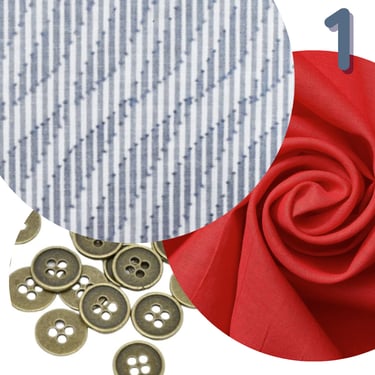 Stripes with Red Cotton: This combo is 100% cotton with metal buttons, making it a durable skirt that will last you for a long time. The wavy stripes are classic, but playful. The red cotton is lightweight, making it a great overskirt to give you lots of movement. If the red is too bright, consider mixing this print with a navy cotton or chiffon.