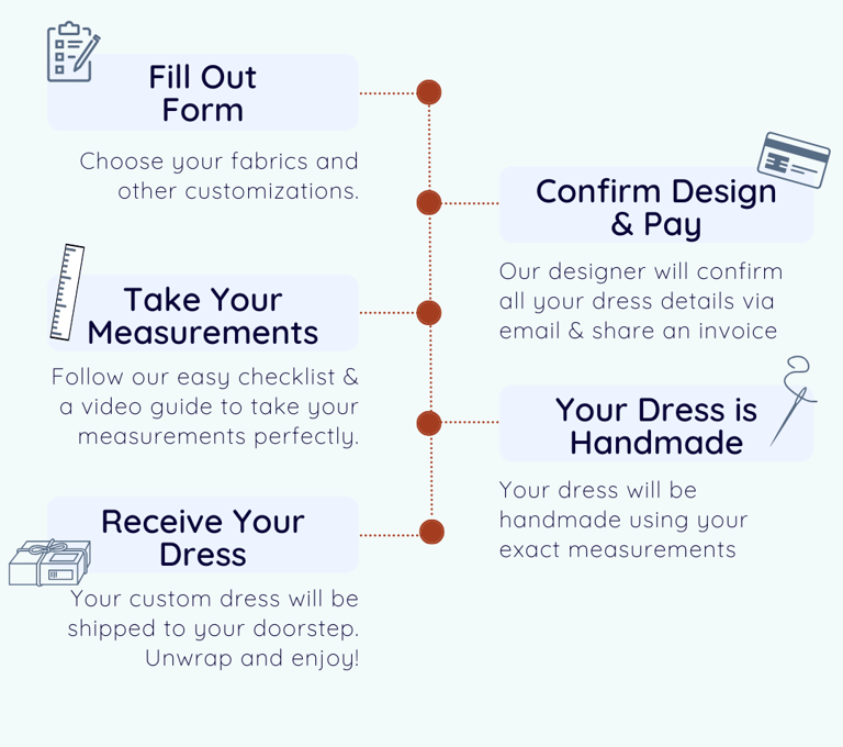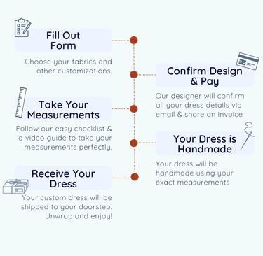 Sizing: Our dress is made using over 20+ measurement to ensure a great fit. Worried about measuring? Don't worry, we have a video tutorial and checklist to guide your through every measurement.