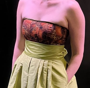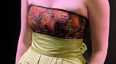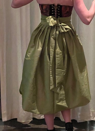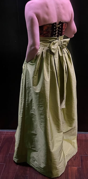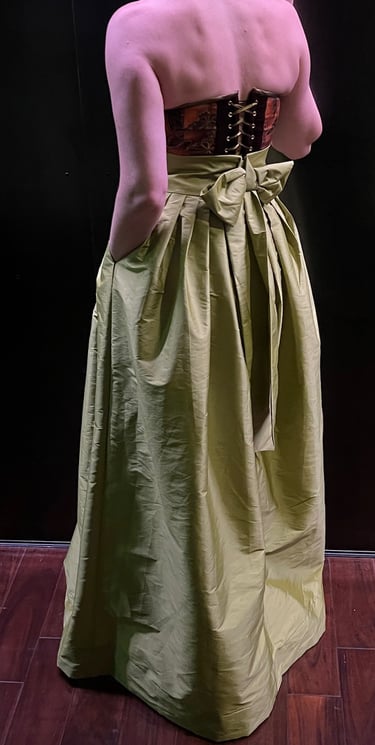 L.D. loves to attend the theater and opera. She wanted a garment that made her feel elegant that she could dress up or down, depending on the dressiness of the event. She likes to show off her shoulders and chest, but wanted to camouflage her arms and stomach. To highlight her body the way she wanted, we pulled on some regal inspiration, creating a dress with a Queen Anne neckline and pointed cape sleeves. We designed a flowy and flowery underskirt bringing some whimsy to the dress. We paired this with a detachable organza overskirt and belt, allowing her to dress up the garment for fancier events. She's ready to see her next show in style.