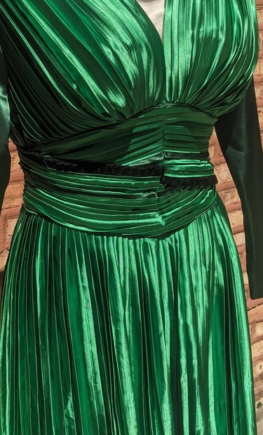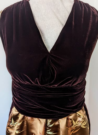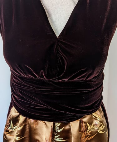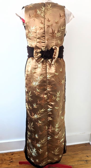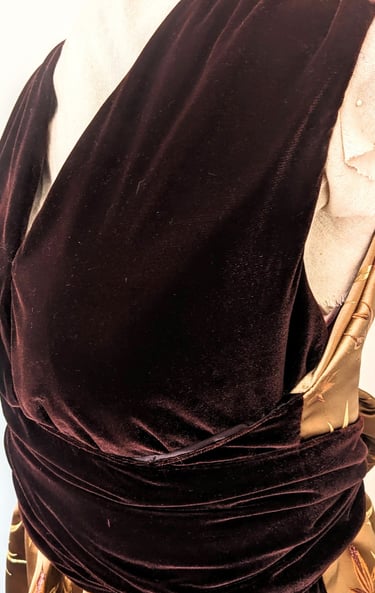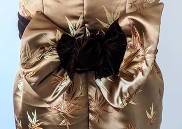 C.M. is six feet tall and has trouble finding floor length gowns that are long enough for her. She wanted an elegant evening dress that she could wear to high end events. We walked the line of elegance and sexy with this dress. The deep neckline in the bodice and the double slits in the skirt lets her show off her shape, while still being appropriate for all type of events. The bodice wraps across the waist and ties in the back in a beautiful bow, giving her a defined waist and stunning statement in the back. This dress is made from a smooth brocade and soft velvet, making this dress one of the most lushest to touch. C.M. Loved all the details of this dress and can't wait to wear it to her next event.