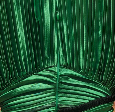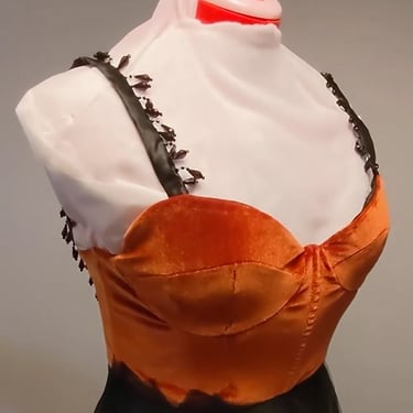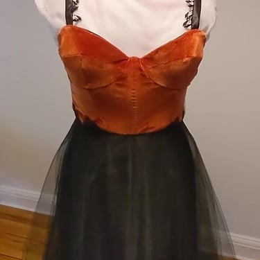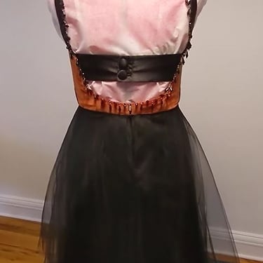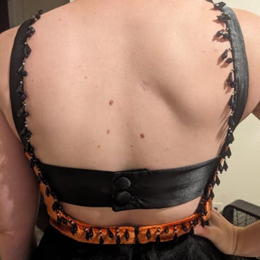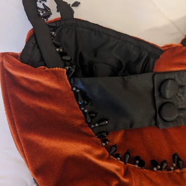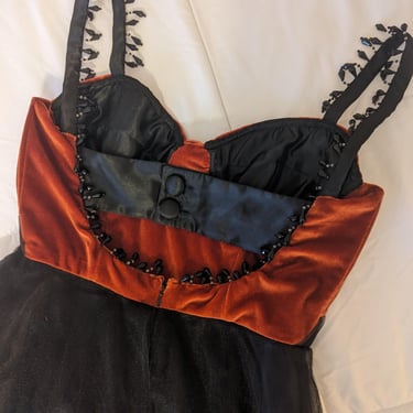 N.L. is a wedding planner and needed a dress to wear to formal events and fundraisers. She wanted a dress with a sweetheart bust that emphasized her chest and distracted from her midsection. She loved the idea of a garment that felt amazing to run her hands along, so we gave her a mixture of soft luscious velvet, a comfortable satin underskirt, and a full wild tulle skirt. The elegant beaded straps sweep into a low back that looks stunning on her. The satin strap in the back buttons at the perfect height to disguise a bra strap, while the structured bodice gives her plenty of shape, so she can wear this dress with or without a bra. She's ready for her next event!
