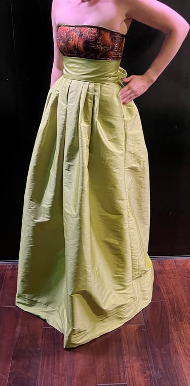 E.L. had an upcoming black tie wedding and she wanted to feel great walking in with her partner. She wanted a form fitted bodice and something that hugged her curves. Being a tall woman, she wanted to be able to wear the dress with heels and have it come all the way to the floor. We gave her a gold strapless bodice that showed off her cleavage, while being secure. We balanced the gold with a rich brown, but brought in gold detail along the double slits to tie the two pieces together. The skirt fit her hips like a glove and she felt amazing for the event.