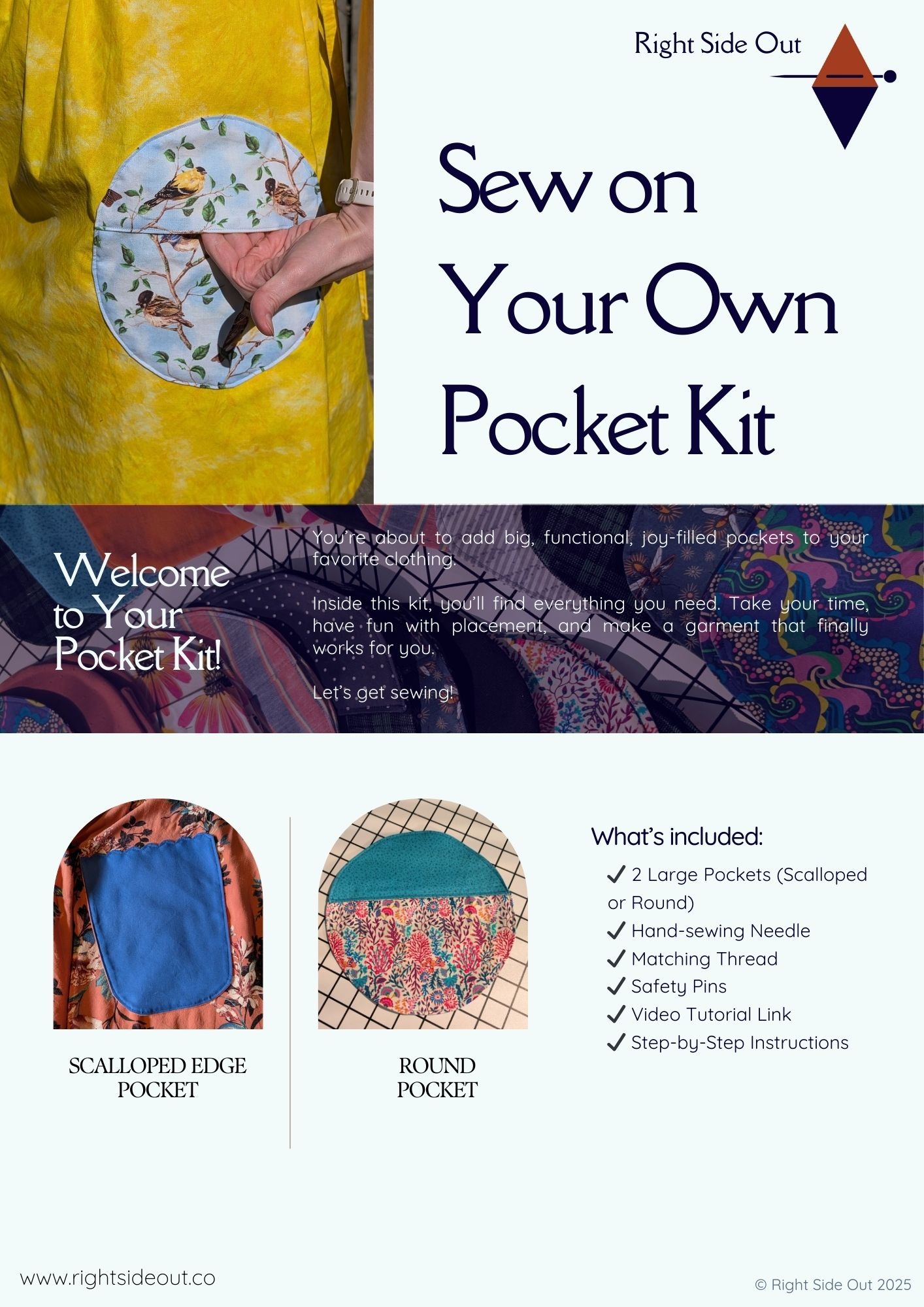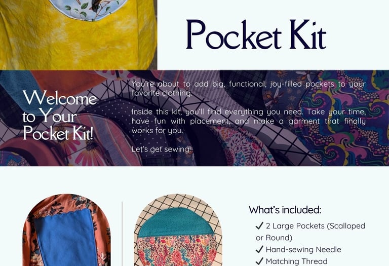 Download the step by step guide for the Sew Your Own Pocket kit. We'll walk you thru every step, so it stays a fun craft without turning into a stressful project.