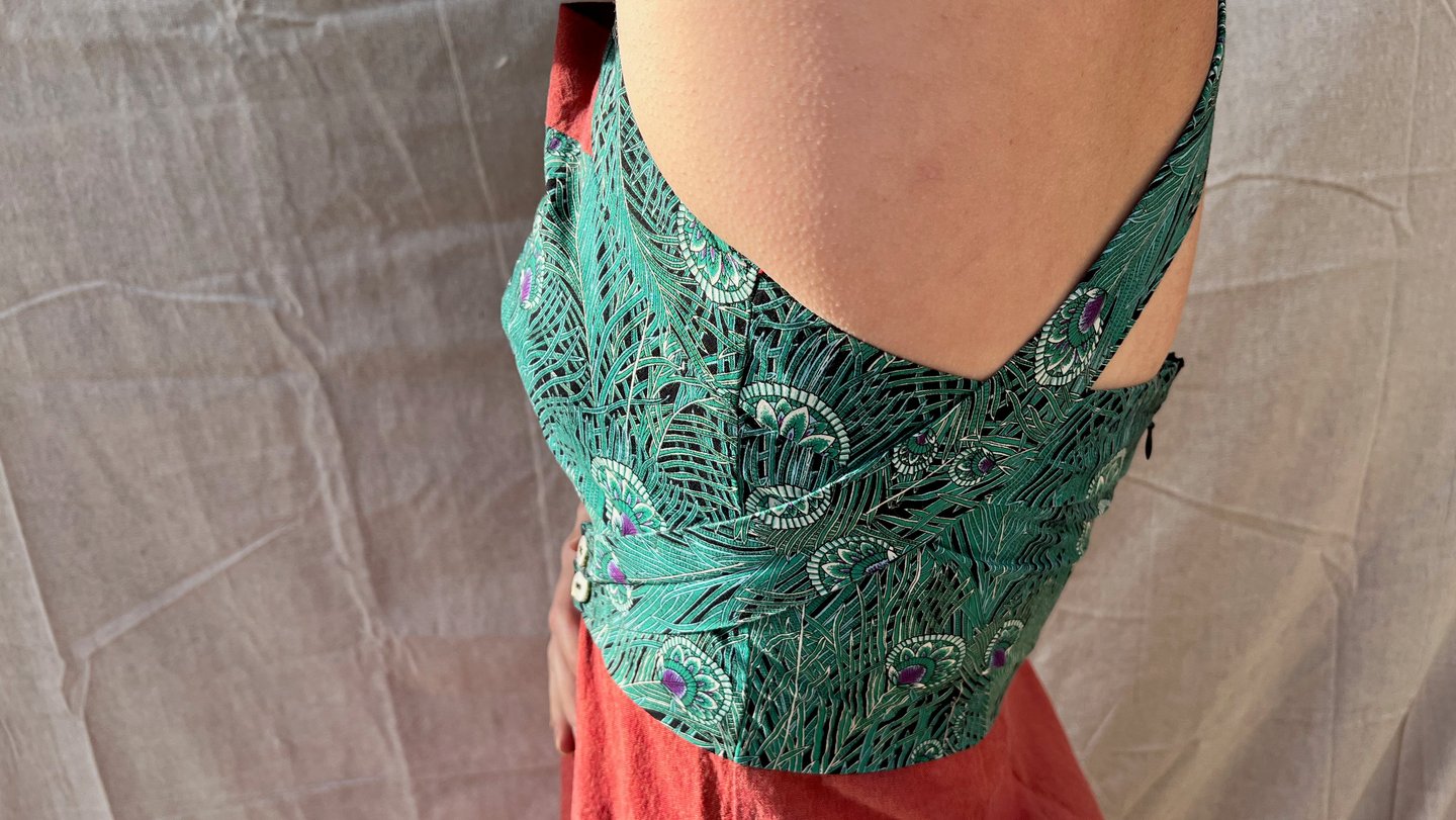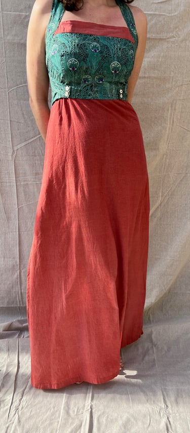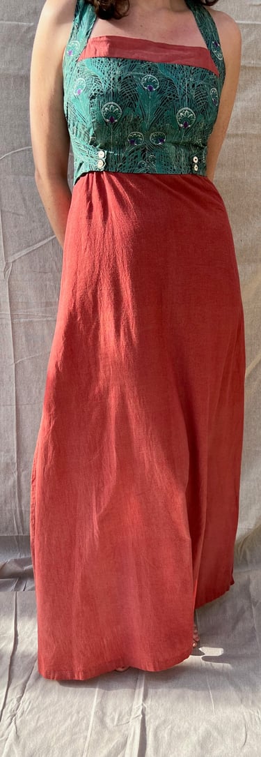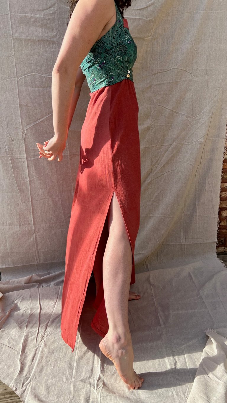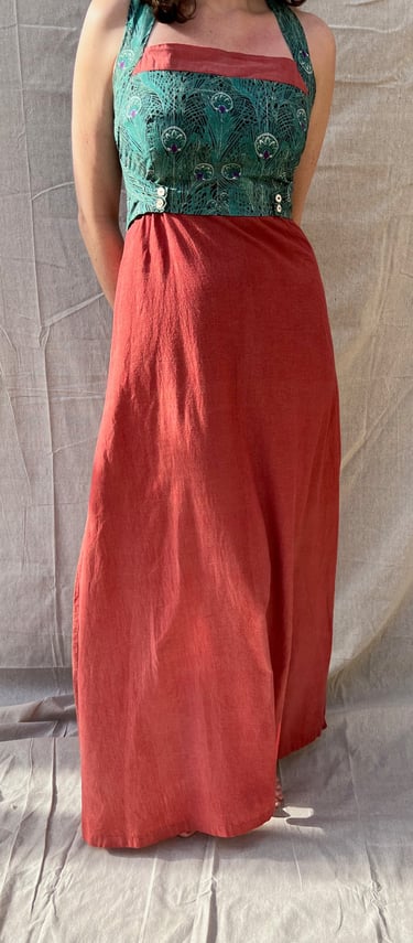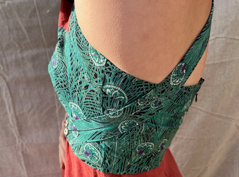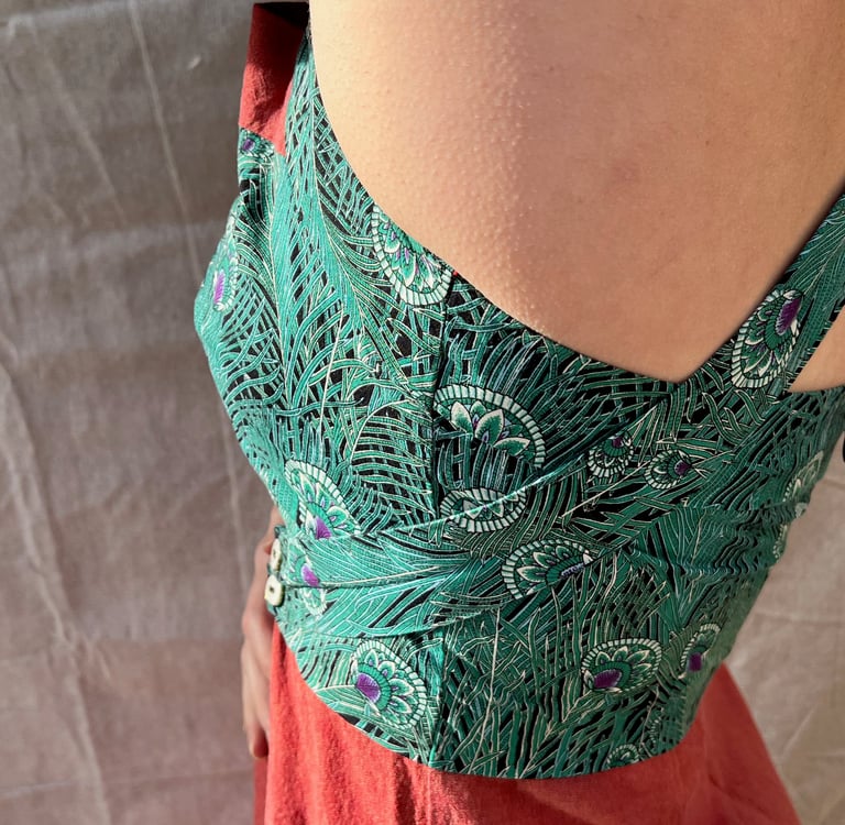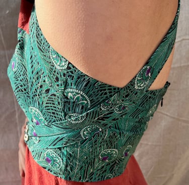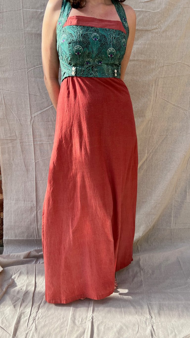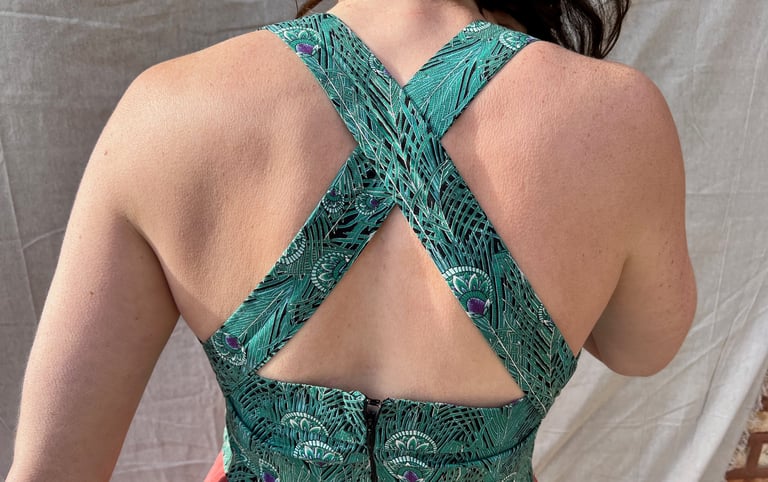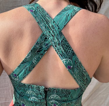 The bold peacock print draws the eye to the bust, making a statement without overpowering. It’s beautifully balanced by the less saturated solid fabric, which flows effortlessly to create a whimsical contrast. The result is a dress that’s vibrant and unique, without feeling like a costume.