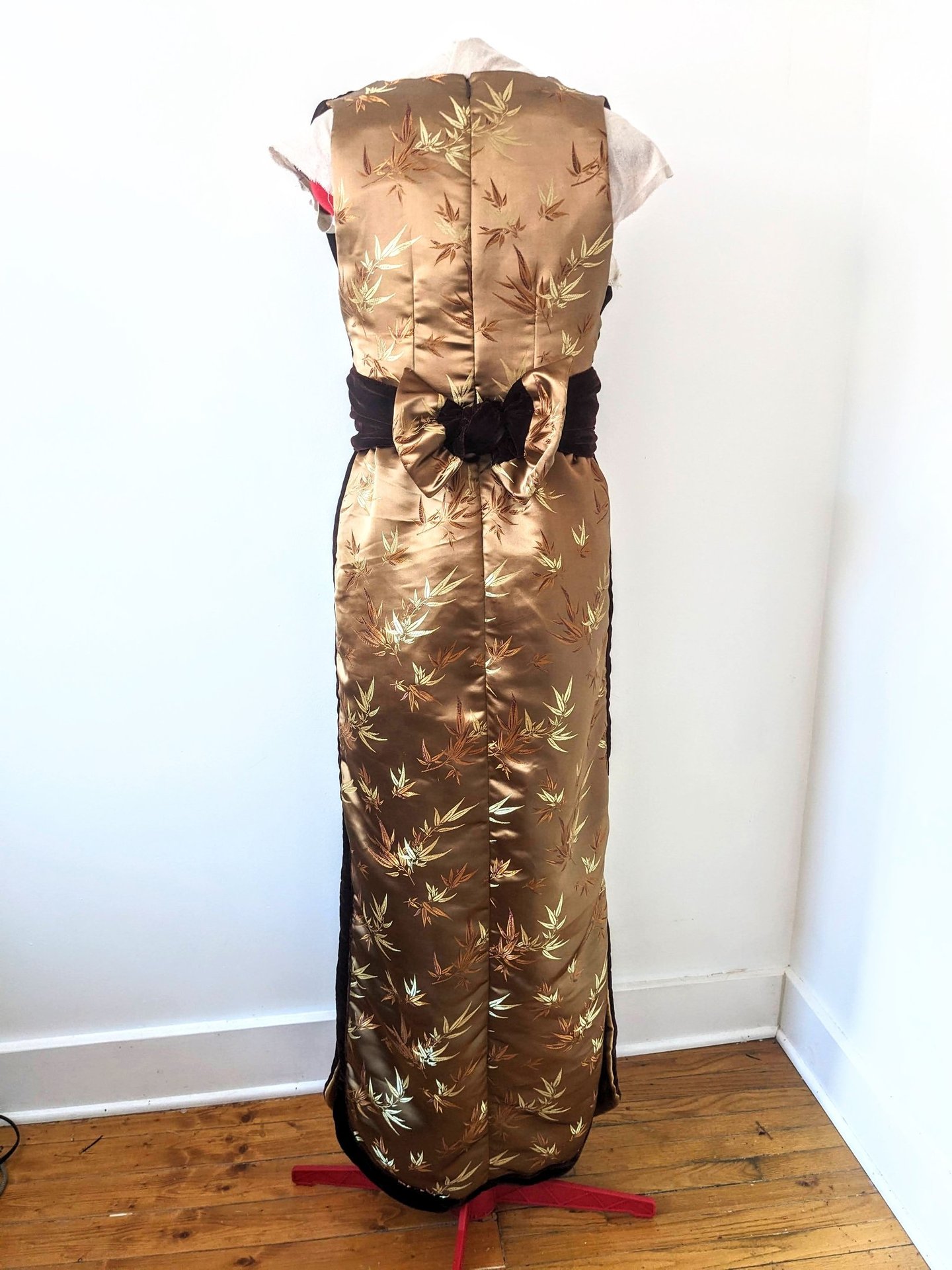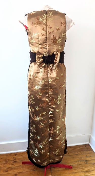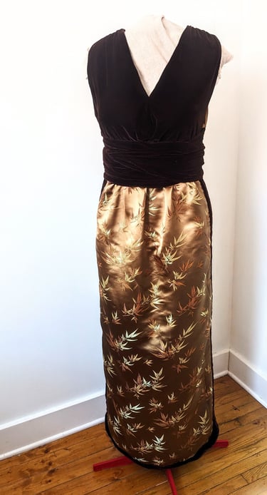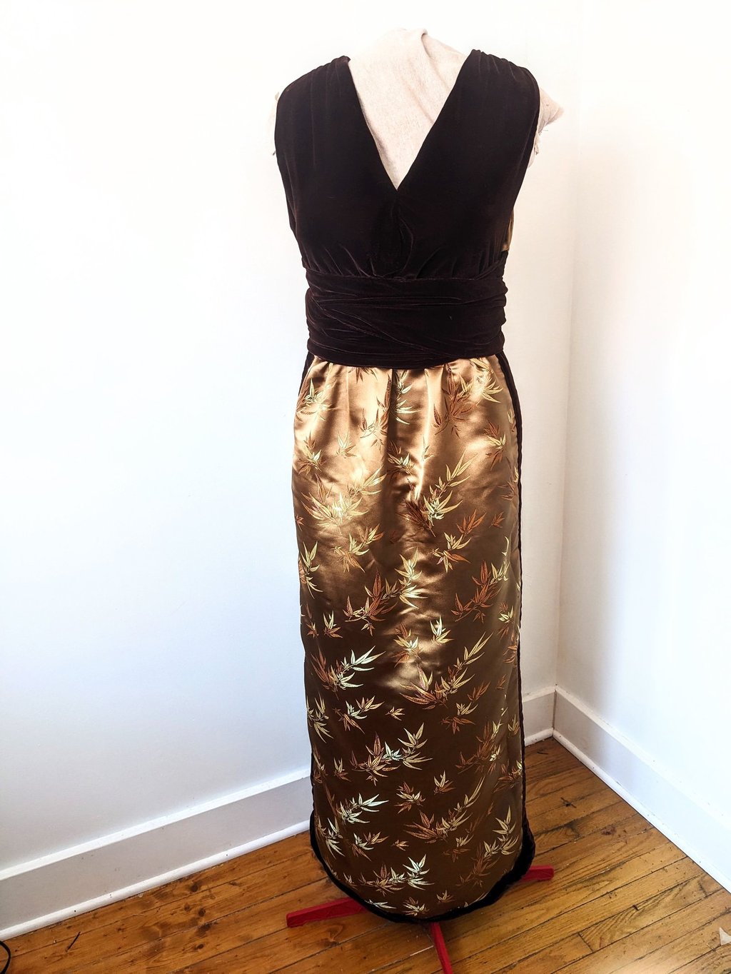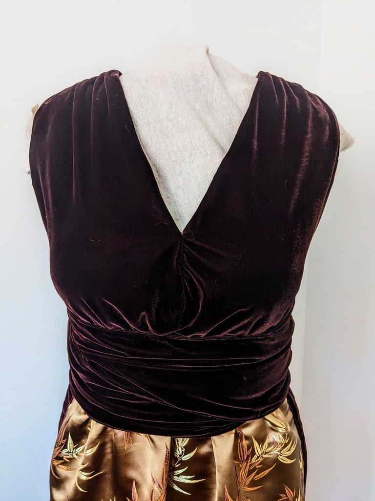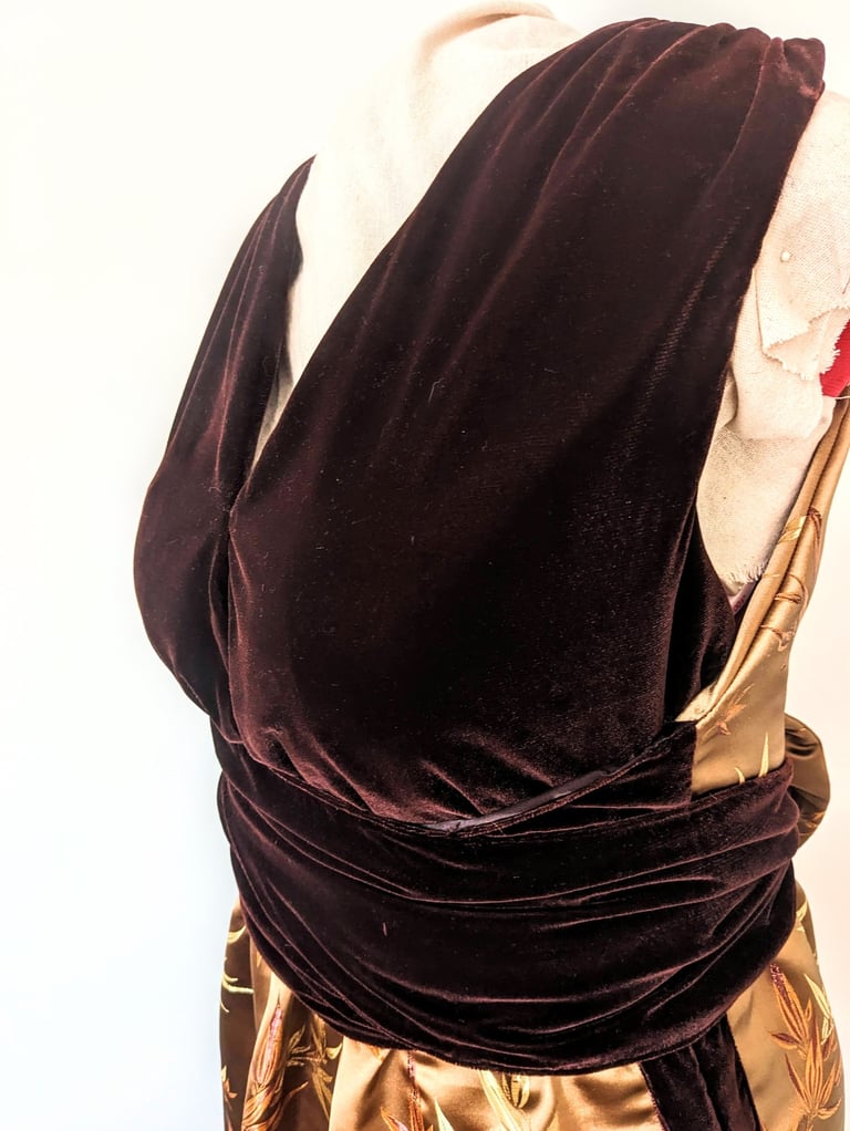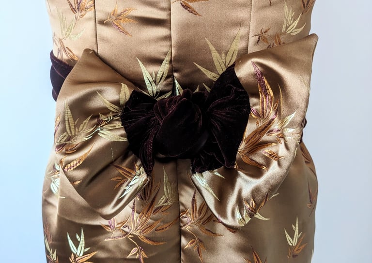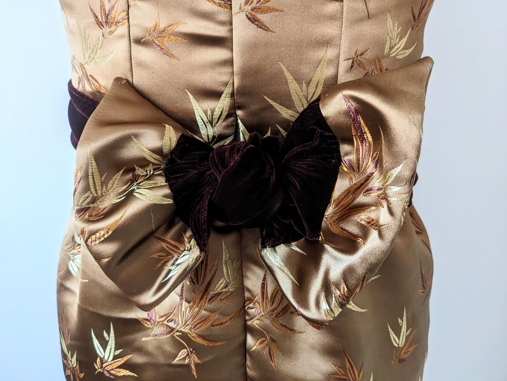 C.M. is six feet tall and has trouble finding floor length gowns that are long enough for her. She wanted an elegant evening dress that she could wear to high end events. We walked the line of elegance and sexy with this dress. The deep neckline in the bodice and the double slits in the skirt lets her show off her shape, while still being appropriate for all type of events. The bodice wraps across the waist and ties in the back in a beautiful bow, giving her a defined waist and stunning statement in the back. This dress is made from a smooth brocade and soft velvet, making this dress one of the most lushest to touch. C.M. Loved all the details of this dress and can't wait to wear it to her next event.