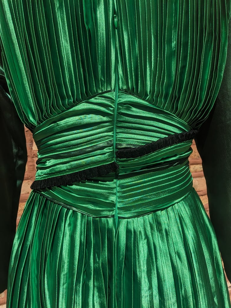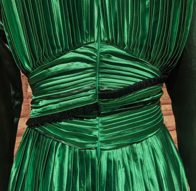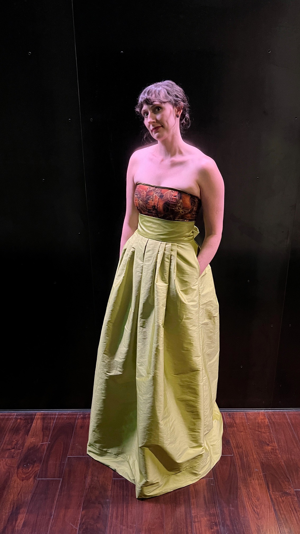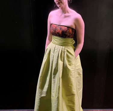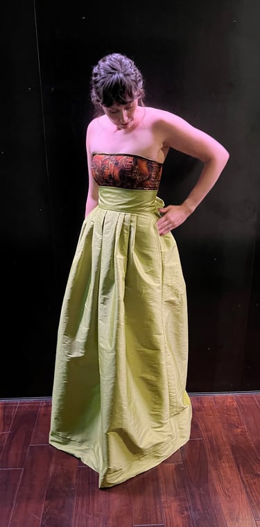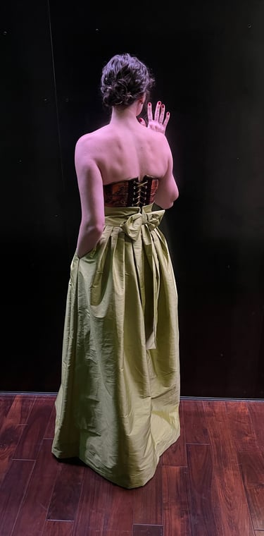 L.D. loves to attend the theater and opera. She wanted a garment that made her feel elegant that she could dress up or down, depending on the dressiness of the event. She likes to show off her shoulders and chest, but wanted to camouflage her arms and stomach. To highlight her body the way she wanted, we pulled on some regal inspiration, creating a dress with a Queen Anne neckline and pointed cape sleeves. We designed a flowy and flowery underskirt bringing some whimsy to the dress. We paired this with a detachable organza overskirt and belt, allowing her to dress up the garment for fancier events. She's ready to see her next show in style.