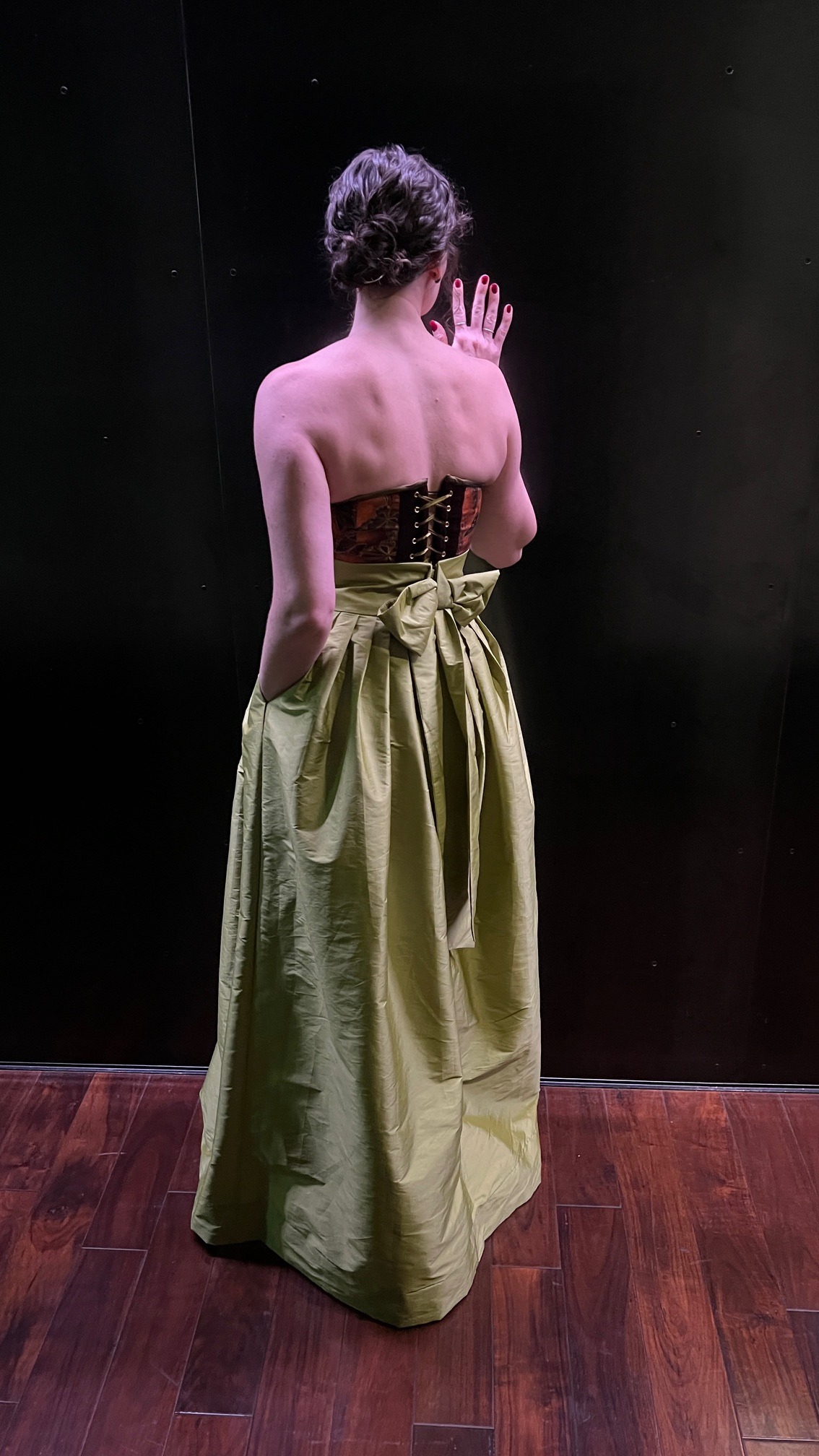 In the skirt we included deep pockets and a feature that allowed the skirt to be shortened in 2 minutes mid-way through the night to allow for hours of dancing, while still looking beautiful in her look.